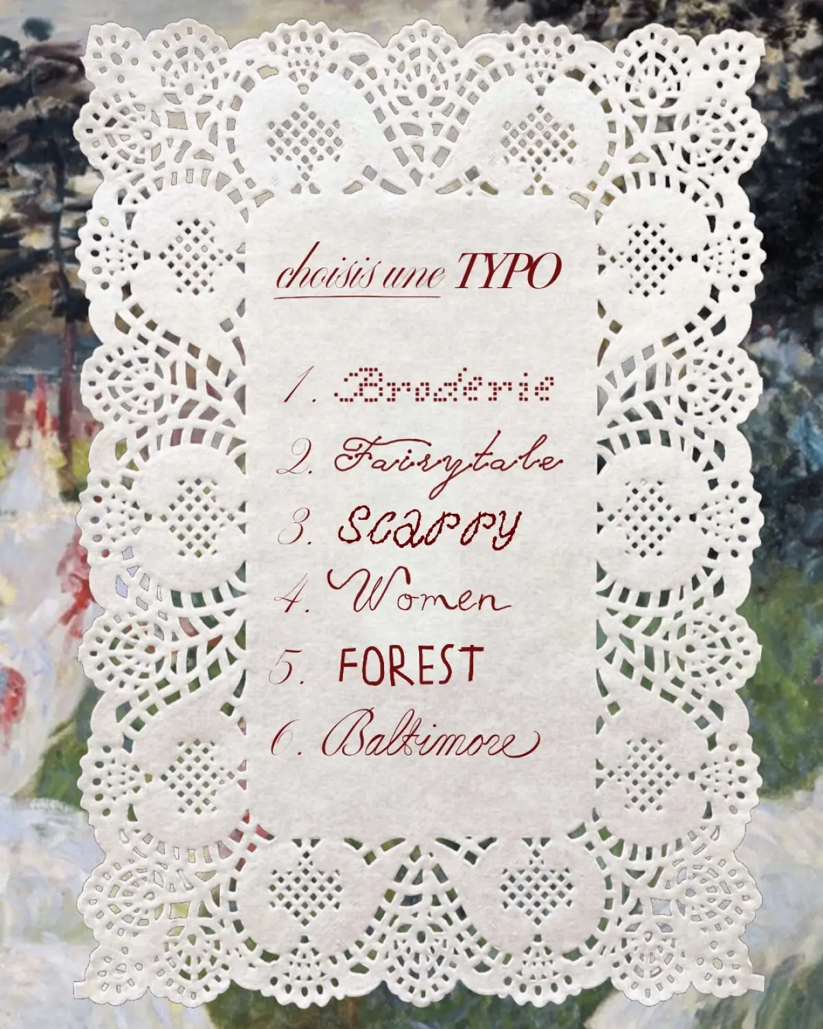 étape 1 : tu choisis la typographie que tu préfères parmi les 6.