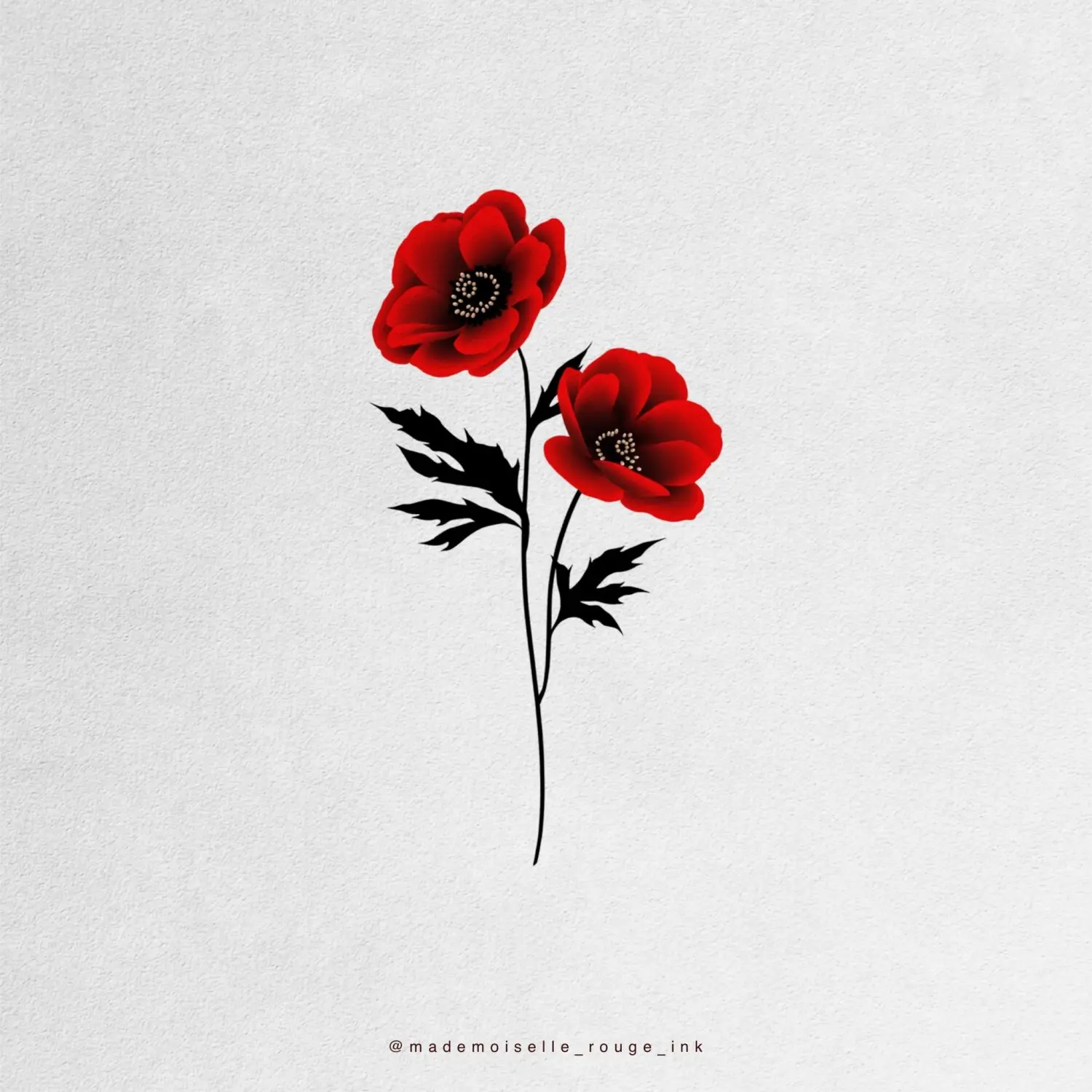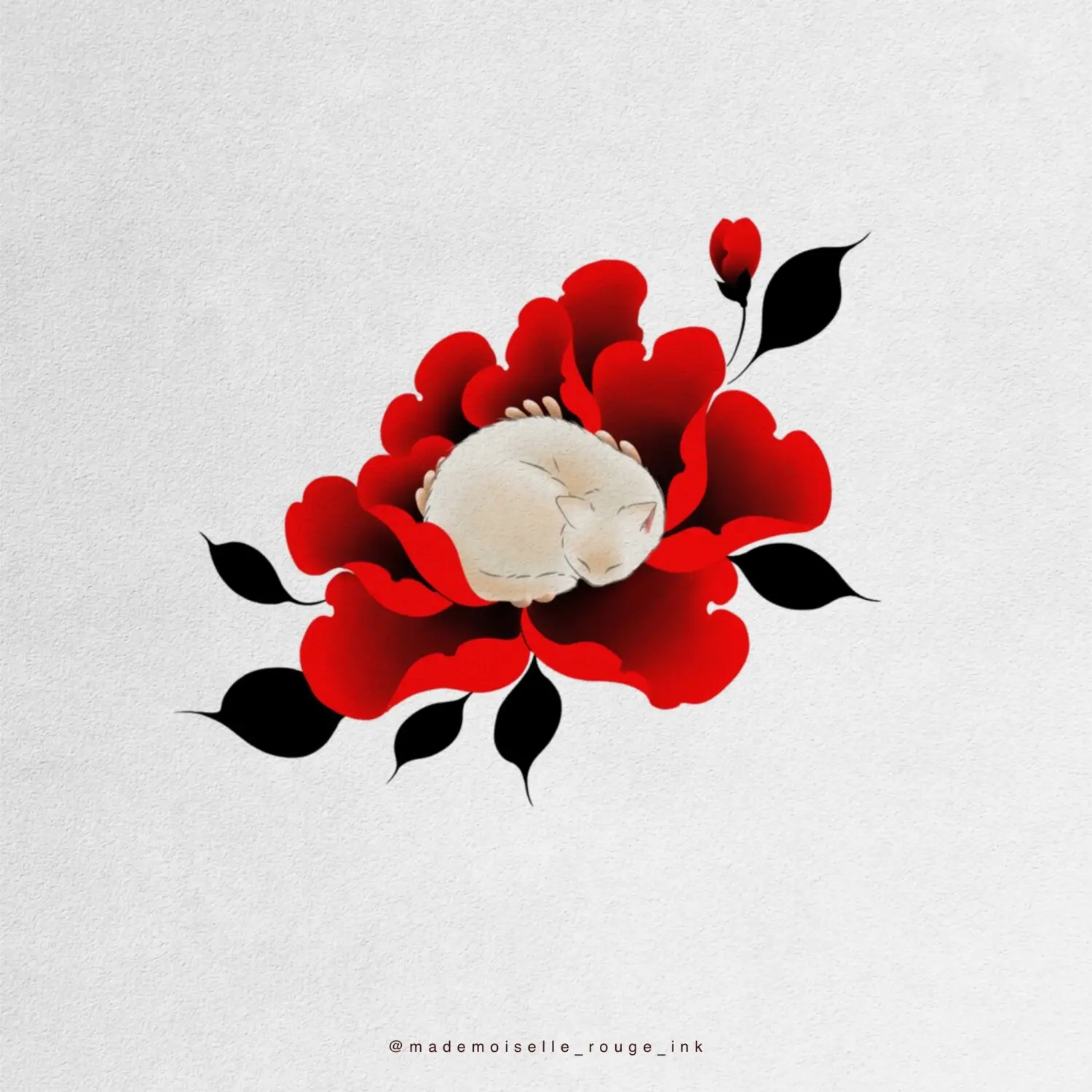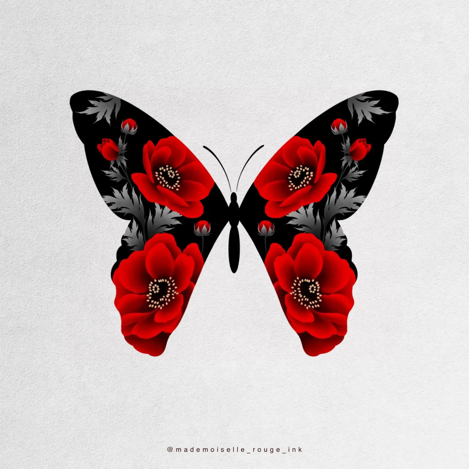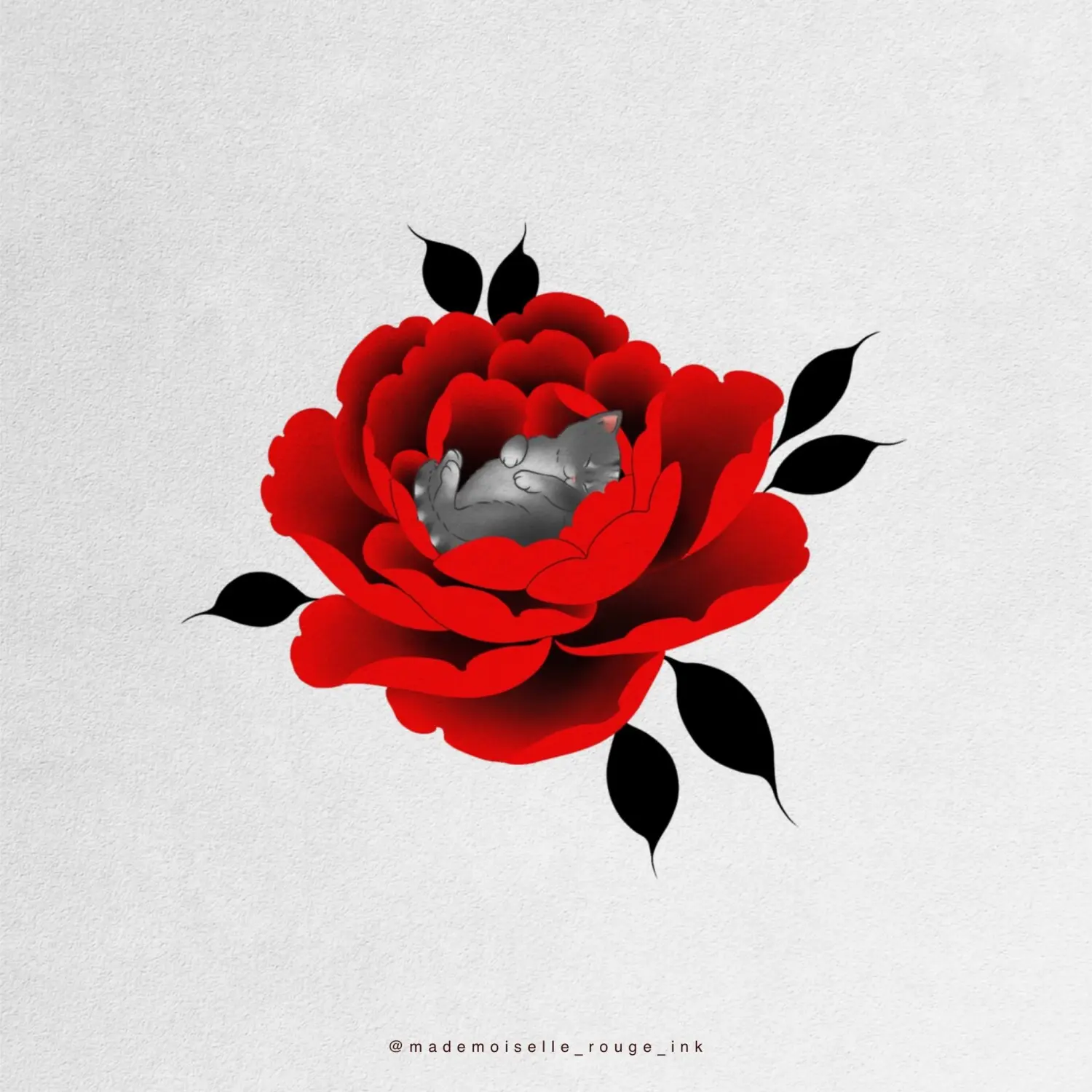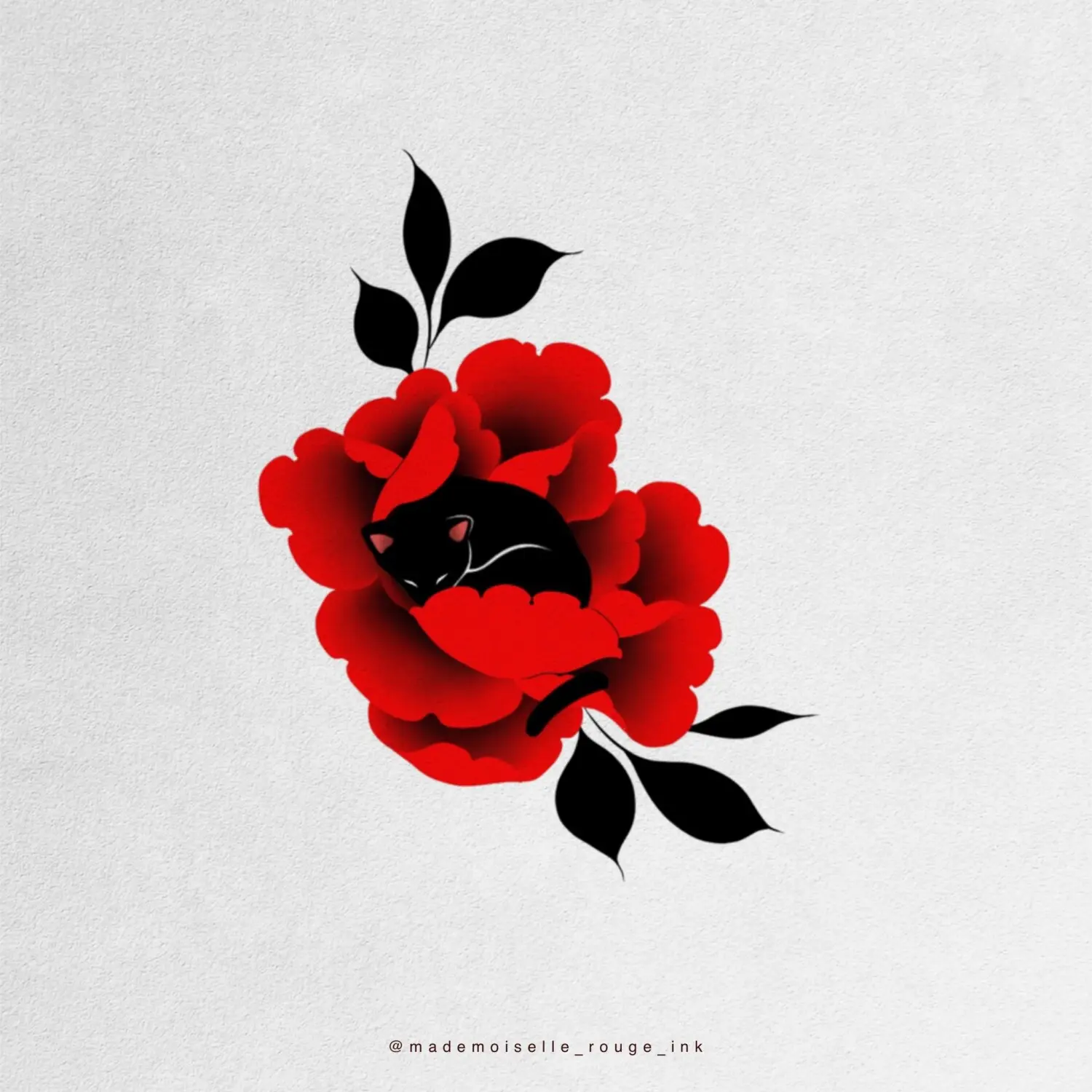 Le projet est entièrement personnalisable : la composition peut être ajustée et modifiée selon les préférences et la morphologie du modèle, que ce soit pour la taille, le placement ou le nombre de pivoines. Il est également possible de remplacer le rouge par des nuances de bleu, ou de réaliser l’ensemble en noir et gris pour un rendu plus classique.
