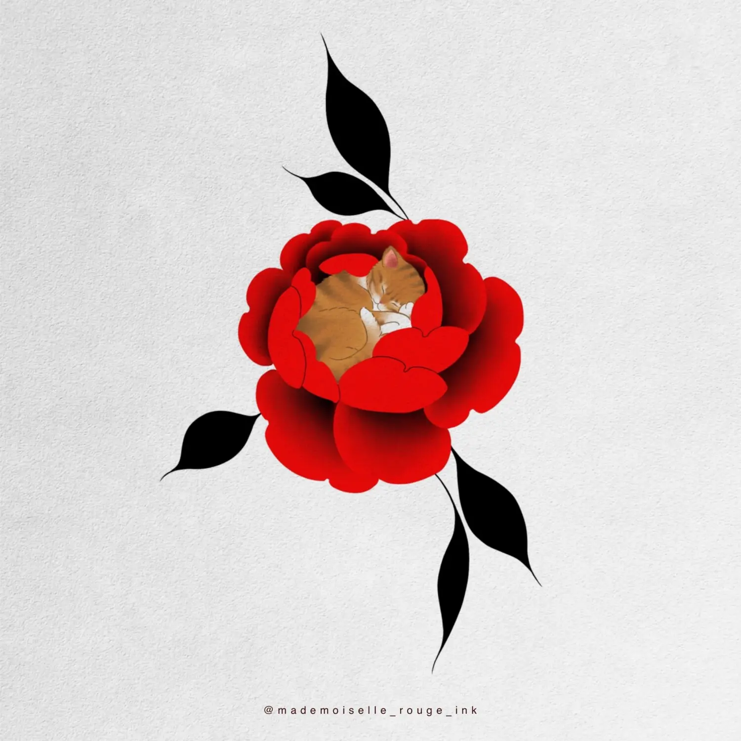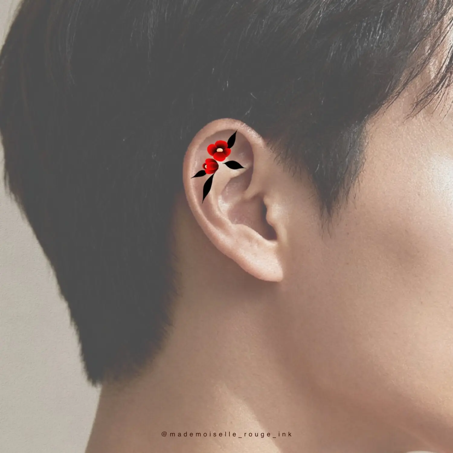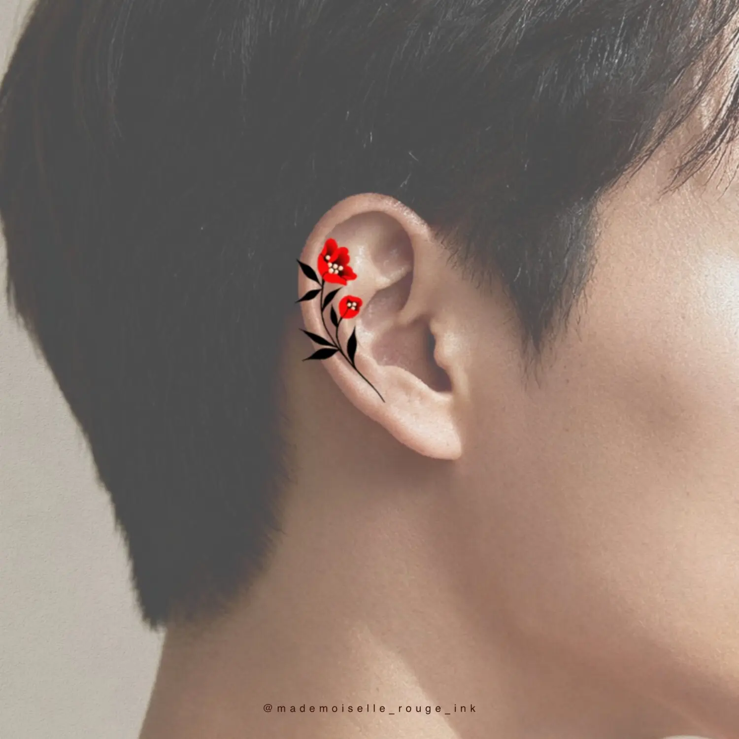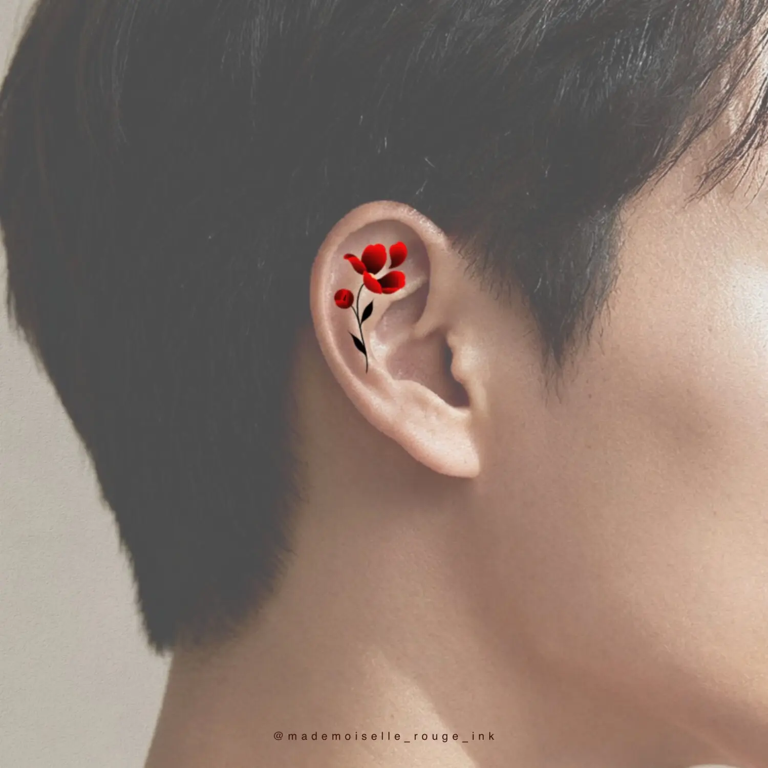 Le projet est entièrement personnalisable : la composition peut être ajustée et modifiée selon les préférences et la morphologie du modèle, que ce soit pour la taille, le placement ou le nombre de pivoines. Il est également possible de remplacer le rouge par des nuances de bleu, ou de réaliser l’ensemble en noir et gris pour un rendu plus classique.