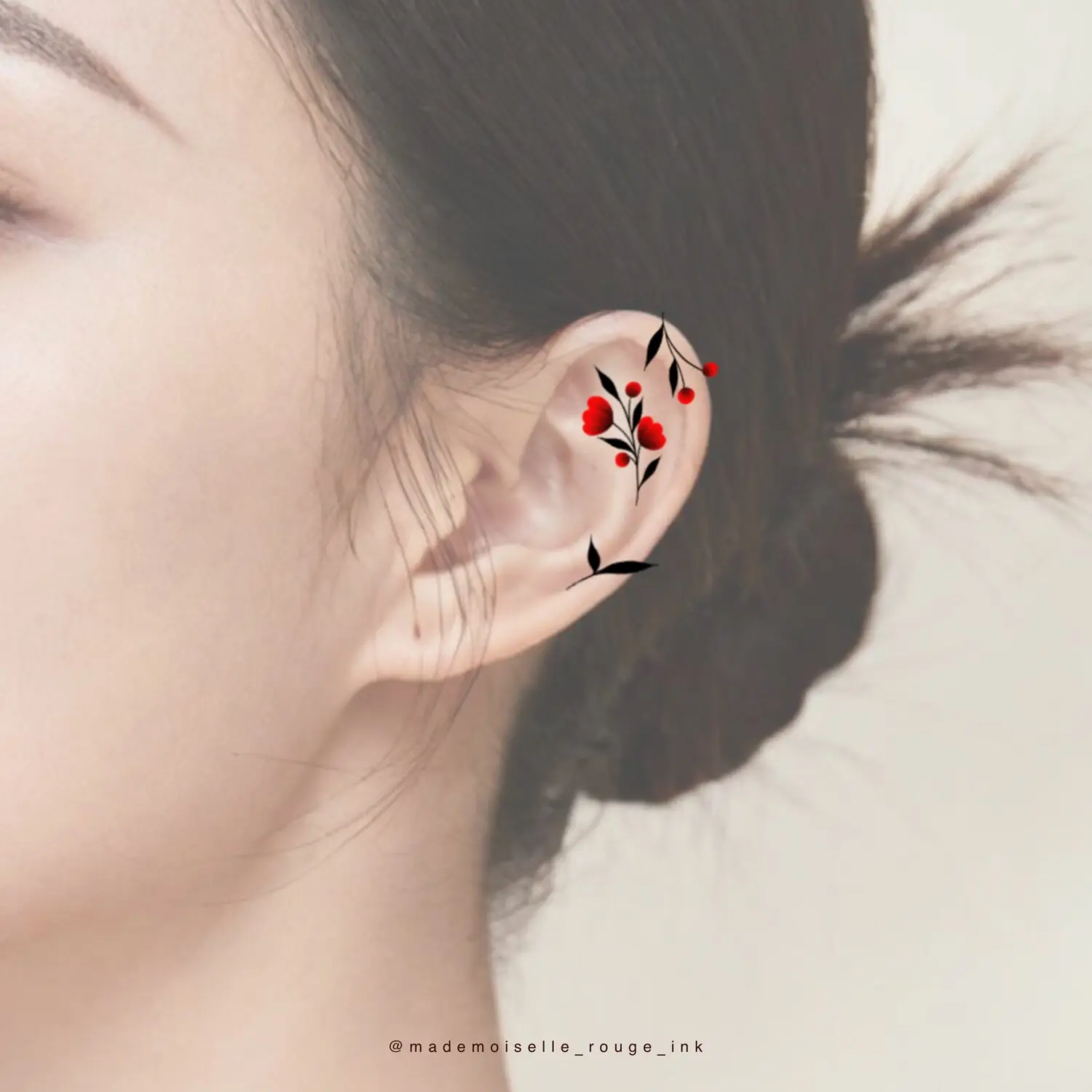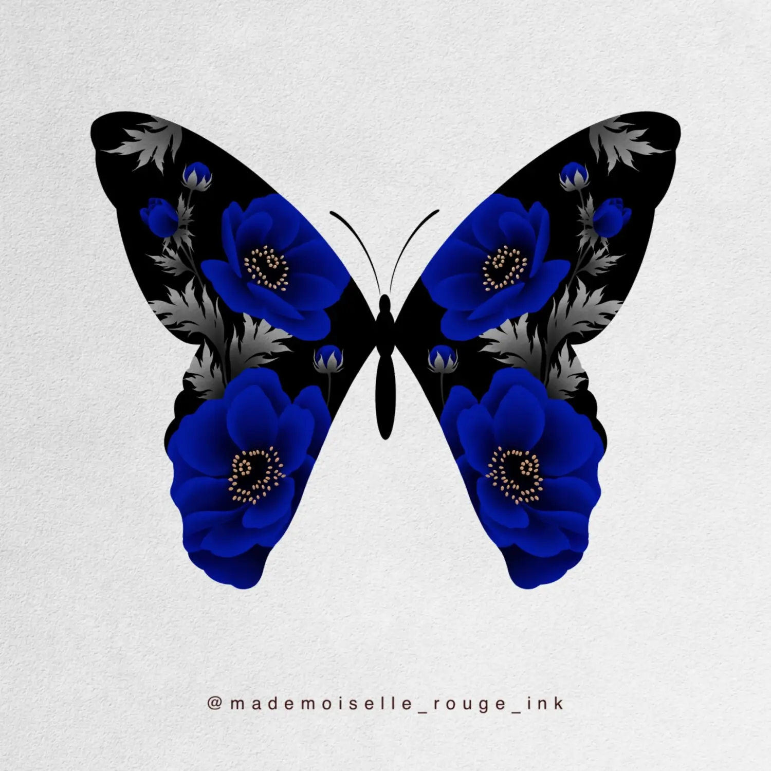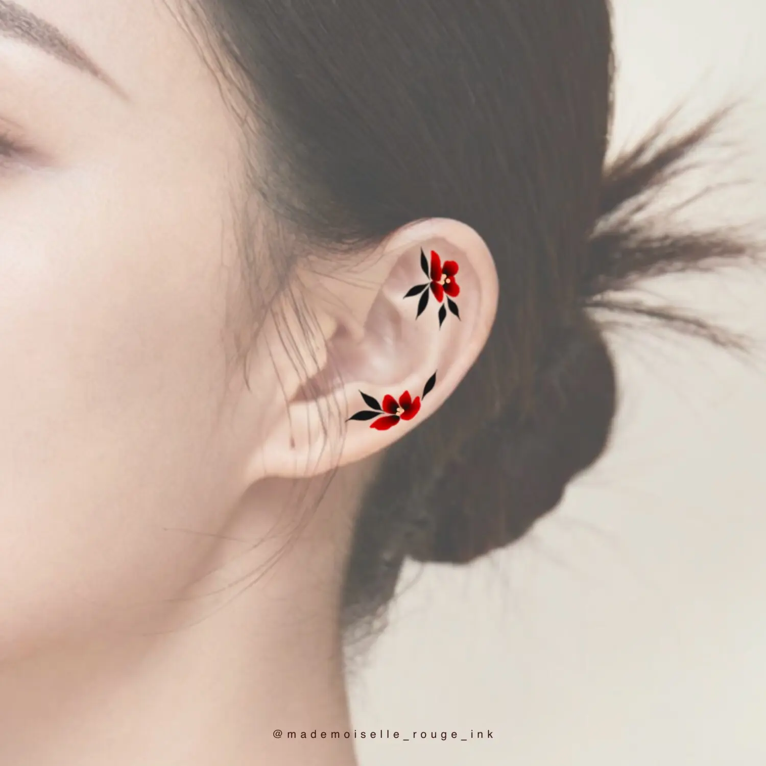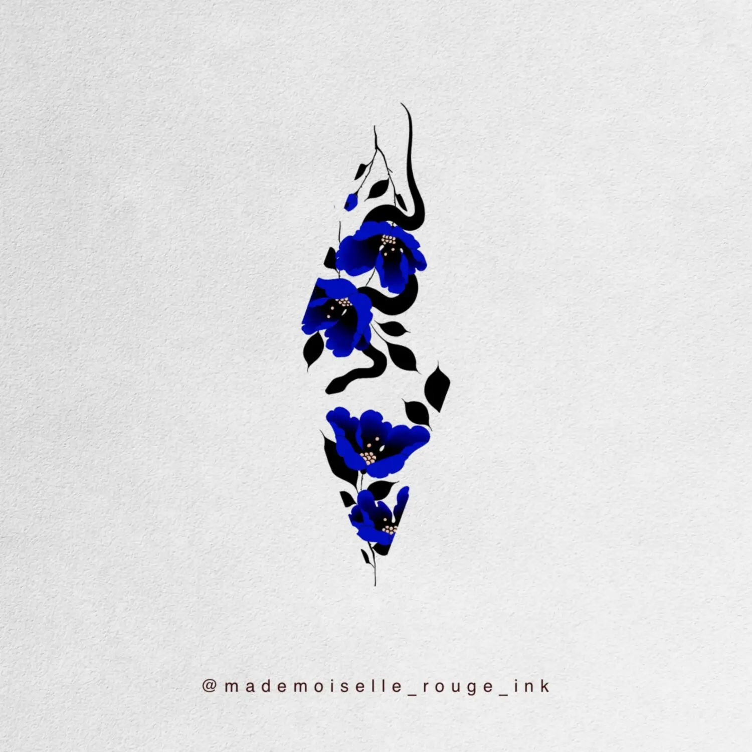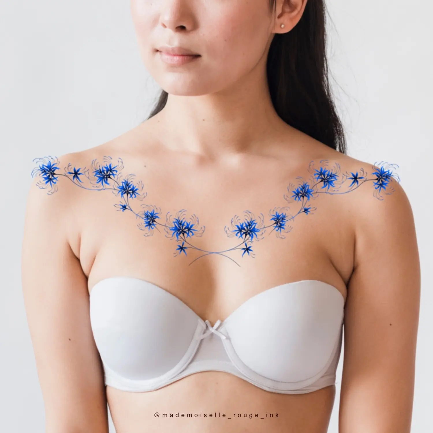 Le projet est entièrement personnalisable : la composition peut être ajustée et modifiée selon les préférences et la morphologie du modèle, que ce soit pour la taille, le placement ou le nombre de pivoines. Il est également possible de remplacer le rouge par des nuances de bleu, ou de réaliser l’ensemble en noir et gris pour un rendu plus classique.