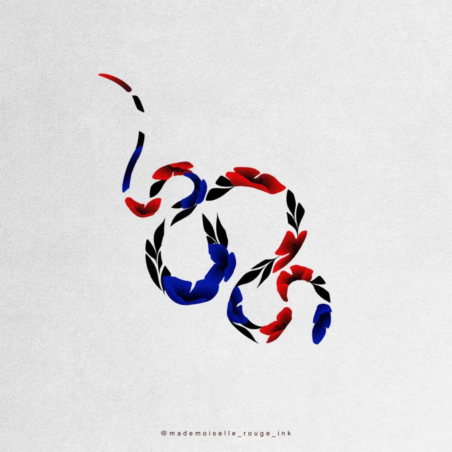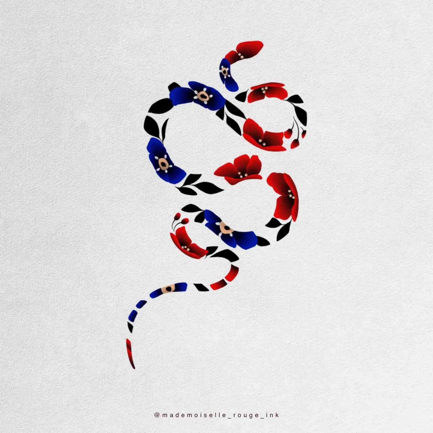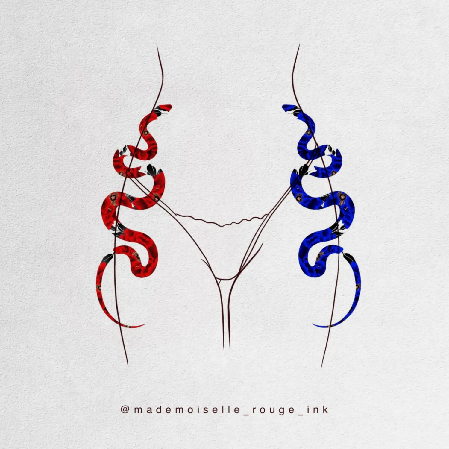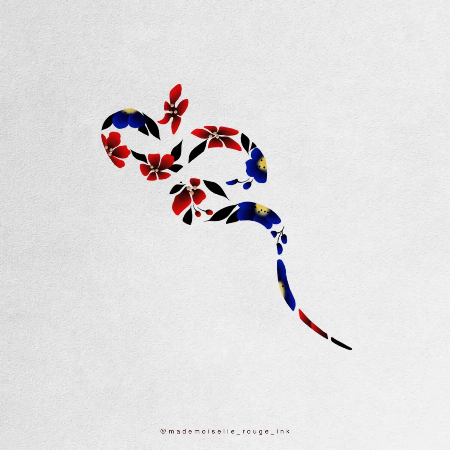 Projet de symétrie parfaite de deux serpents floraux (pivoines coréennes) de grande taille : l’un décliné en rouge vibrant, l’autre en bleu intense, créant un équilibre visuel fort et harmonieux.