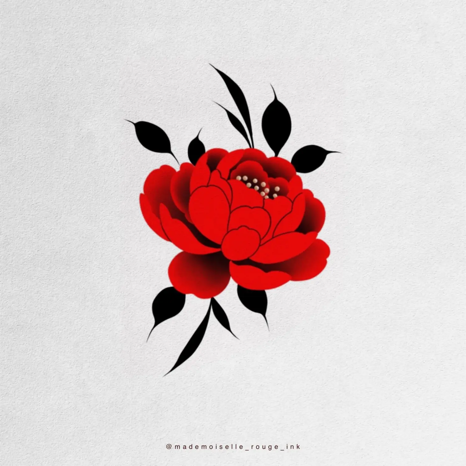 Projet de dos complet composé de grandes pivoines asiatiques rouges, travaillées avec des détails très fins au niveau des pétales pour un rendu minutieux et sophistiqué. Les feuilles seront réalisées dans plusieurs nuances de gris doux, afin de créer un contraste élégant qui met en valeur l’intensité du rouge sans alourdir la composition.