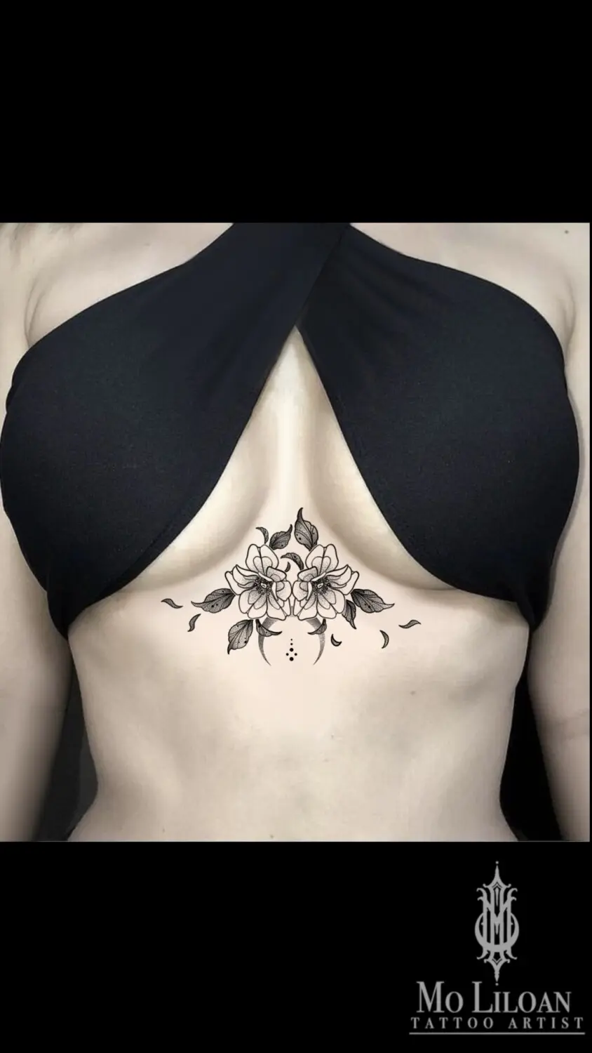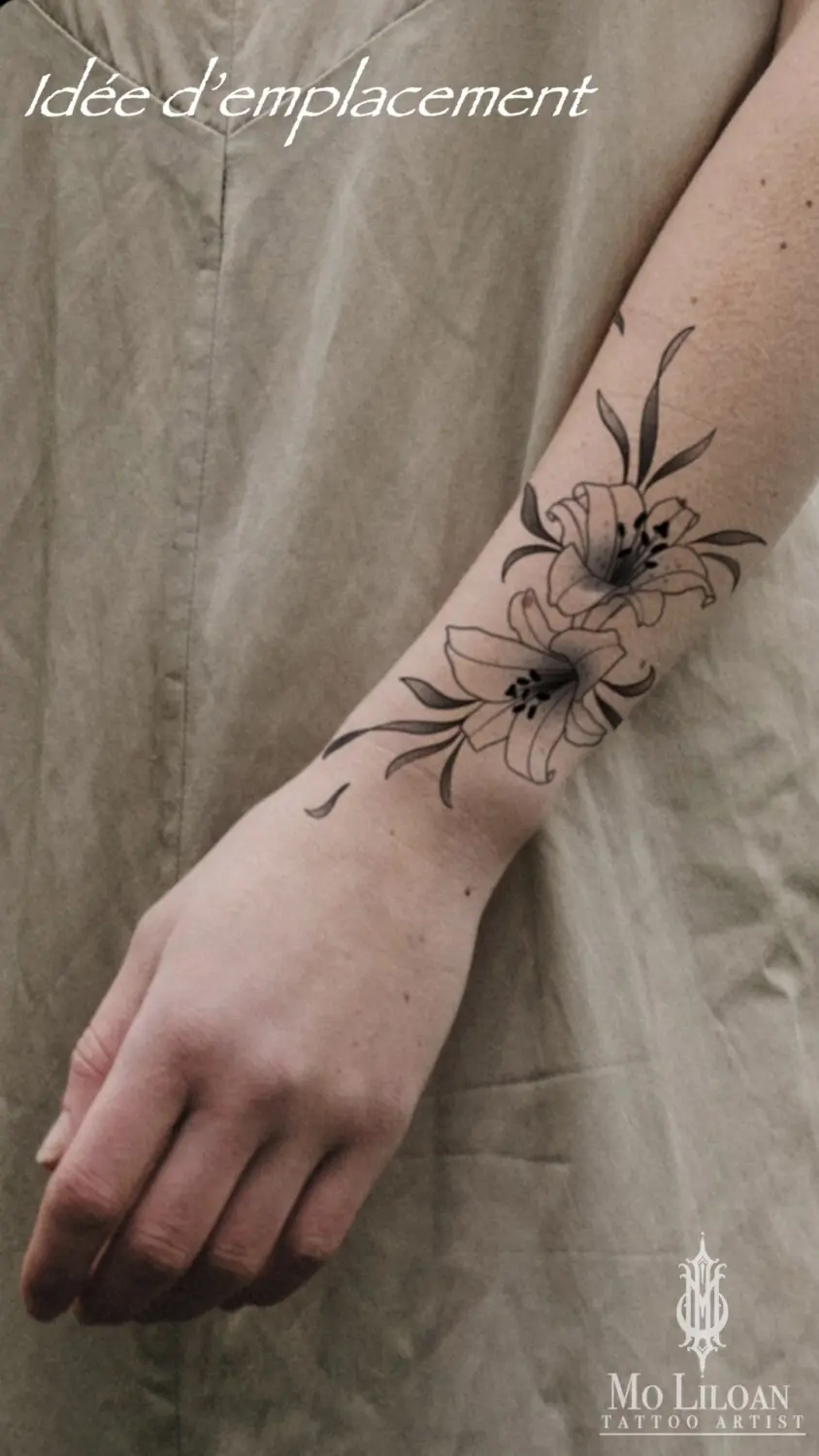 Une belle compo florale grand format, toute en finesse, pour habiller une hanche/cuisse. Possible également de la placer dans le dos.
