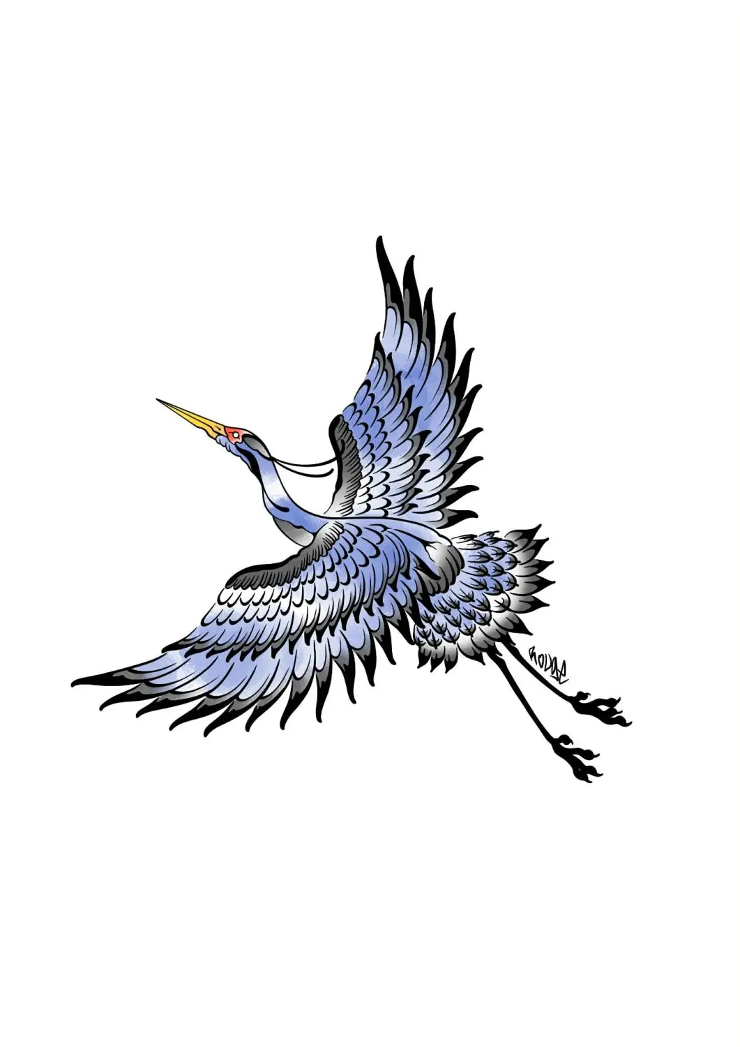 Une grue, un effet aquarelle avec des couleurs dans mon style, qui apporte du relief à ta pièce. Quoi de mieux pour sublimer ton corps 👀