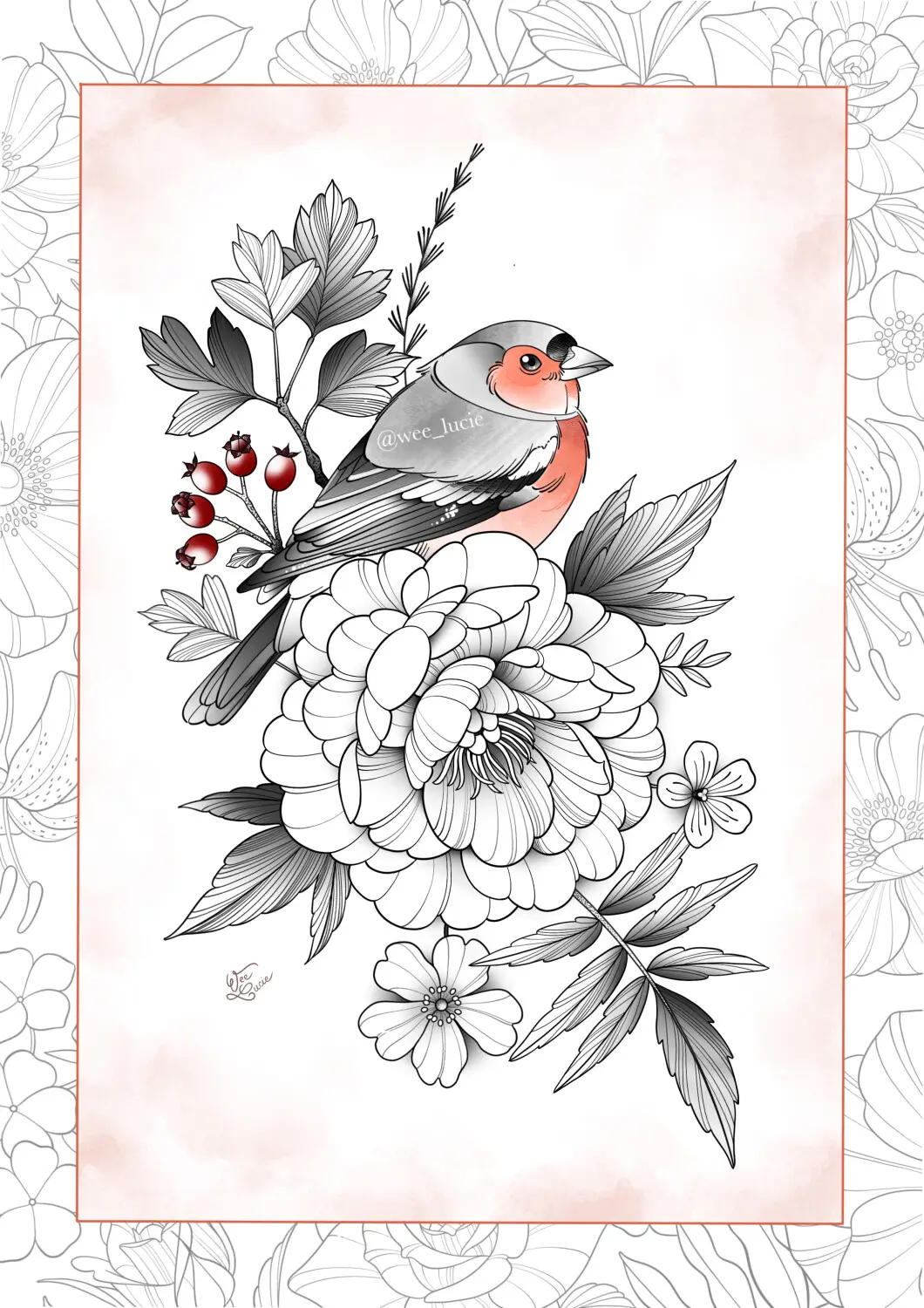Mésange - rose - cadre ornemental
