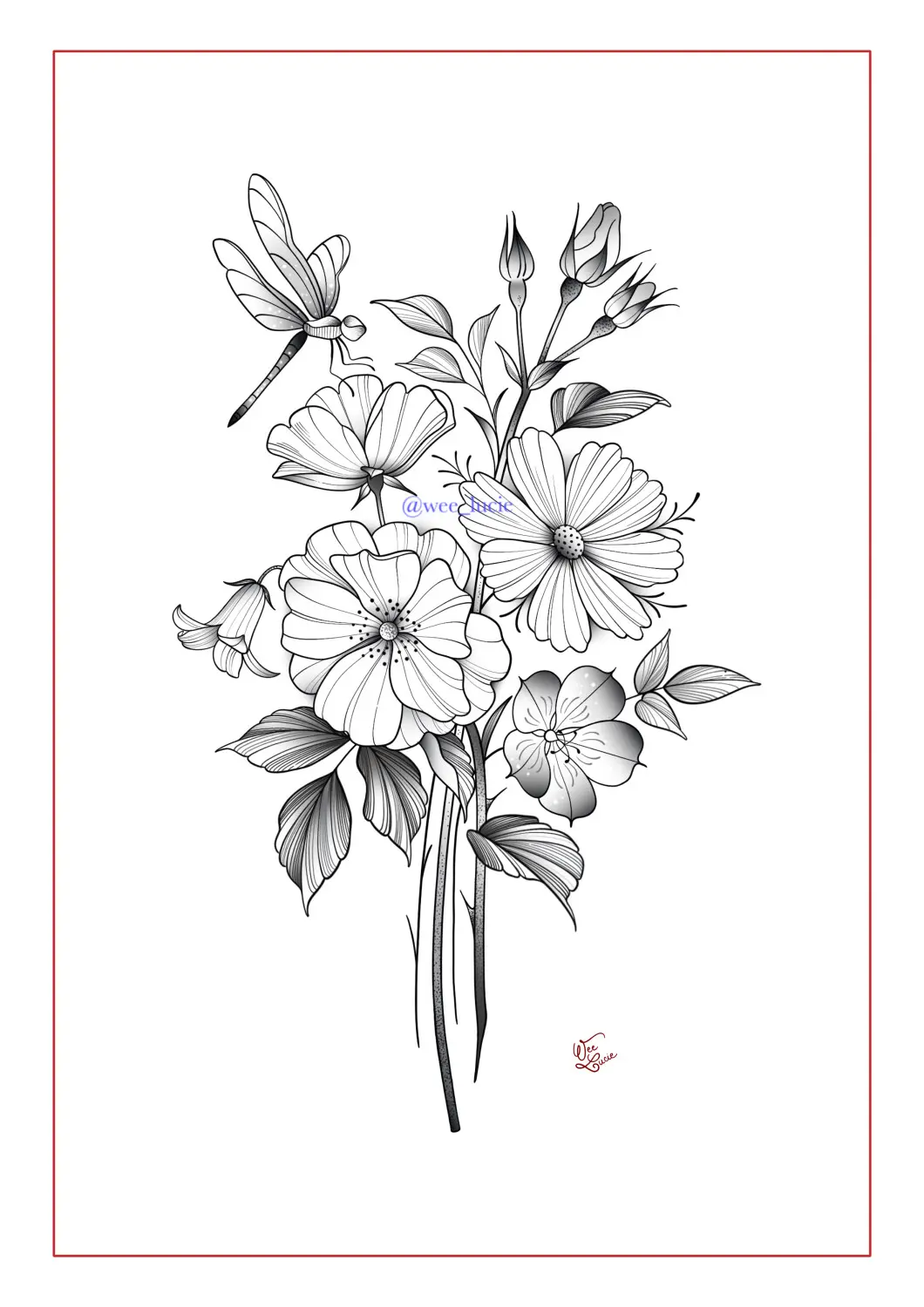 Bouquet roses, cosmos, libellule
