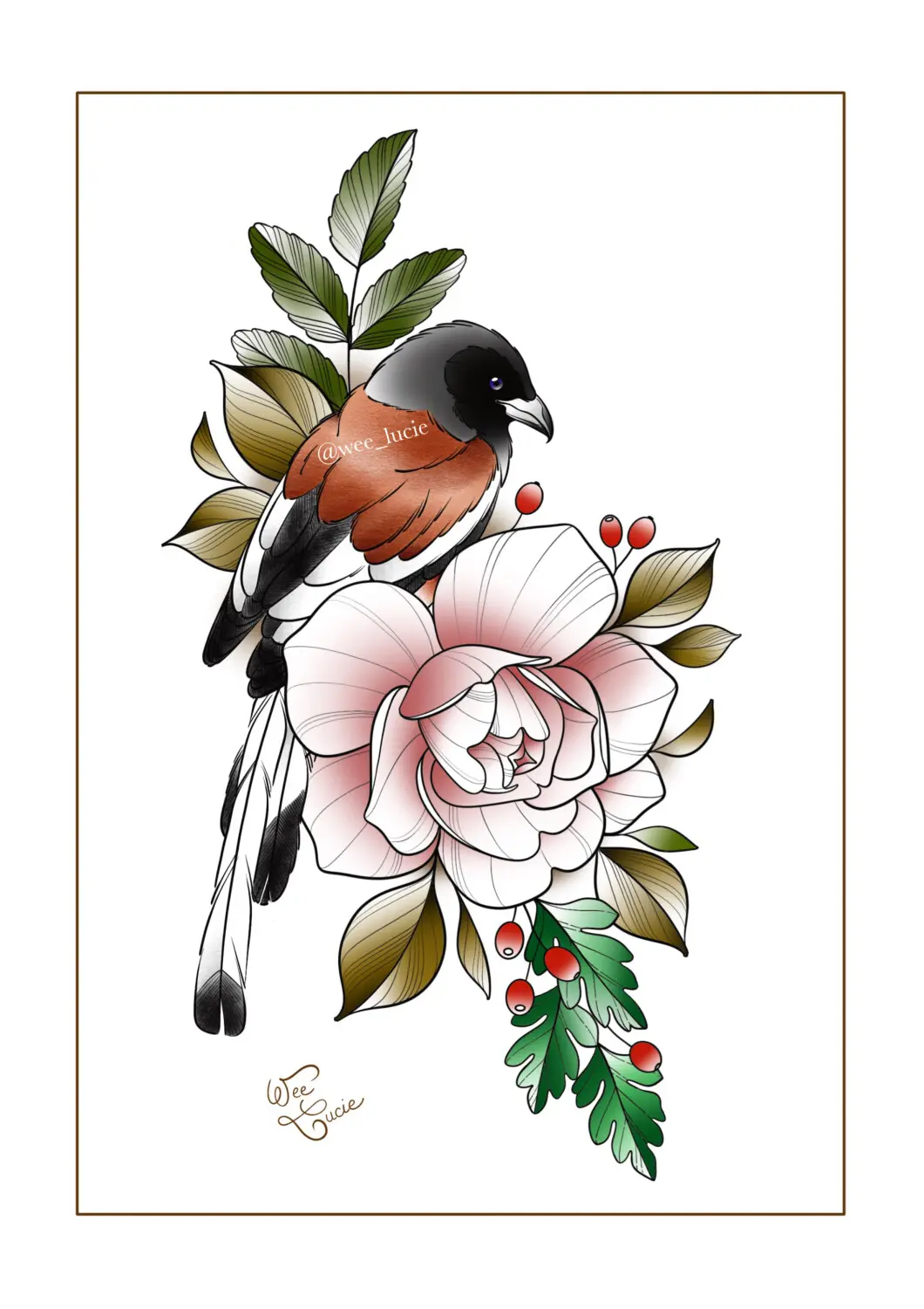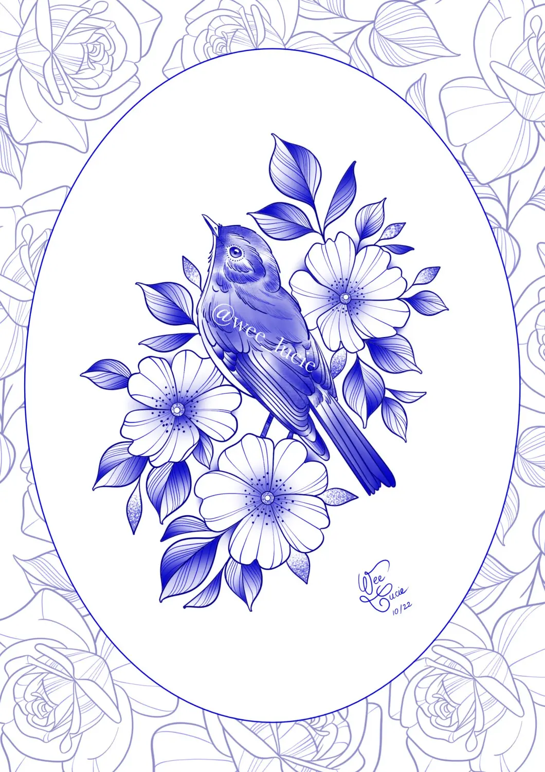 Composition oiseau et églantiers (bleu)