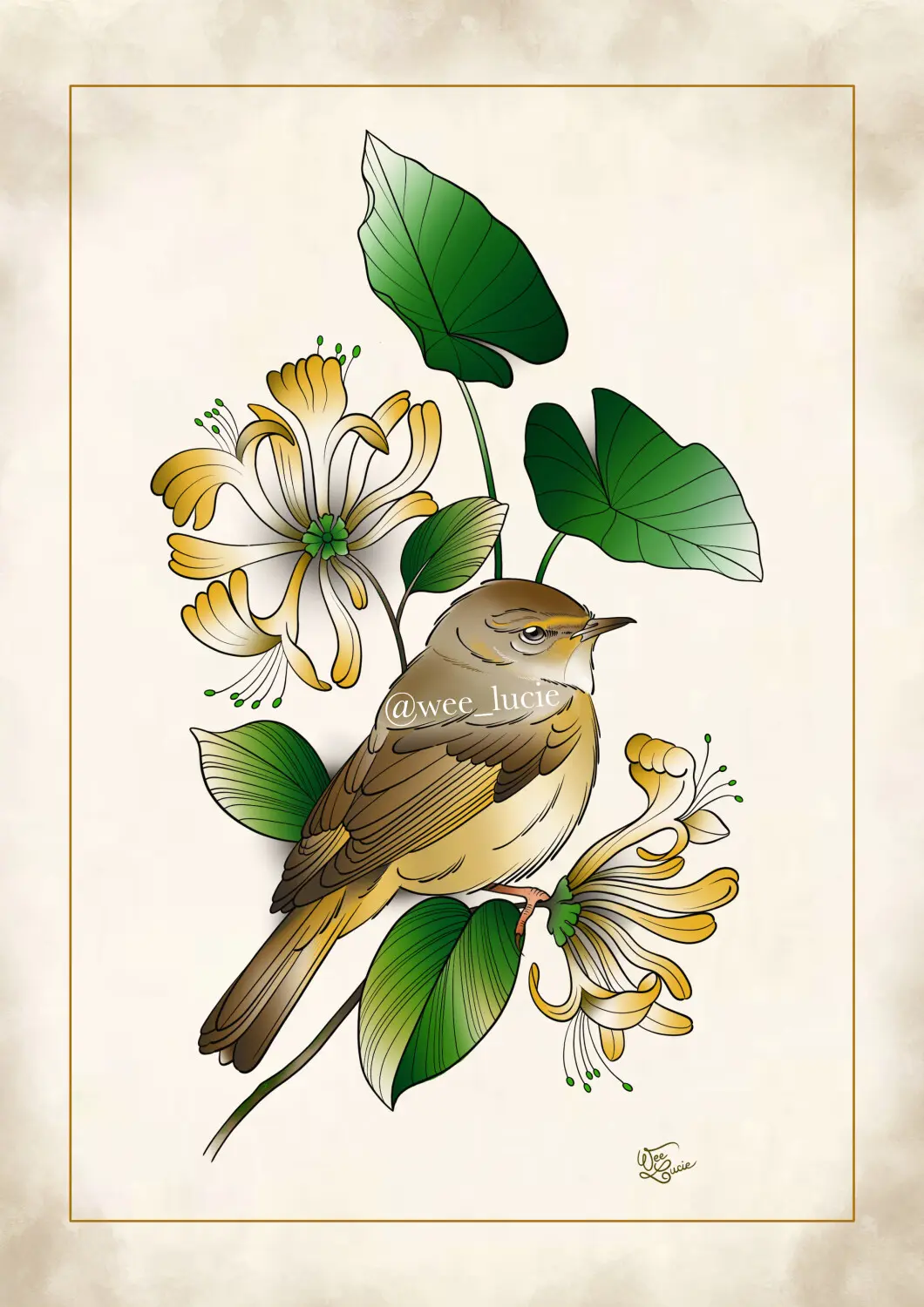Pouillot fitis sur chèvrefeuille et colocasia